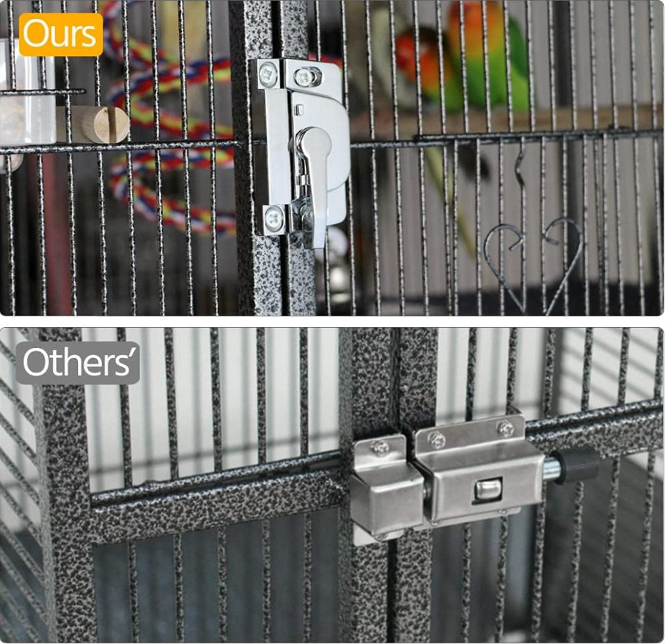 Play-Top Design--On the rooftop of this parrot cage, we prepare a comfortable-to-grip wooden dowel perch, two stainless steel feeders, a ladder and an easy-to-clean tray to collect spilled feeds and dropping. This play-top birdcage is a handy choice if your birds spend most of their time outside the cage.